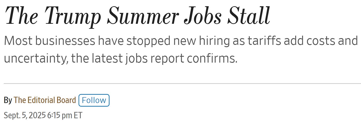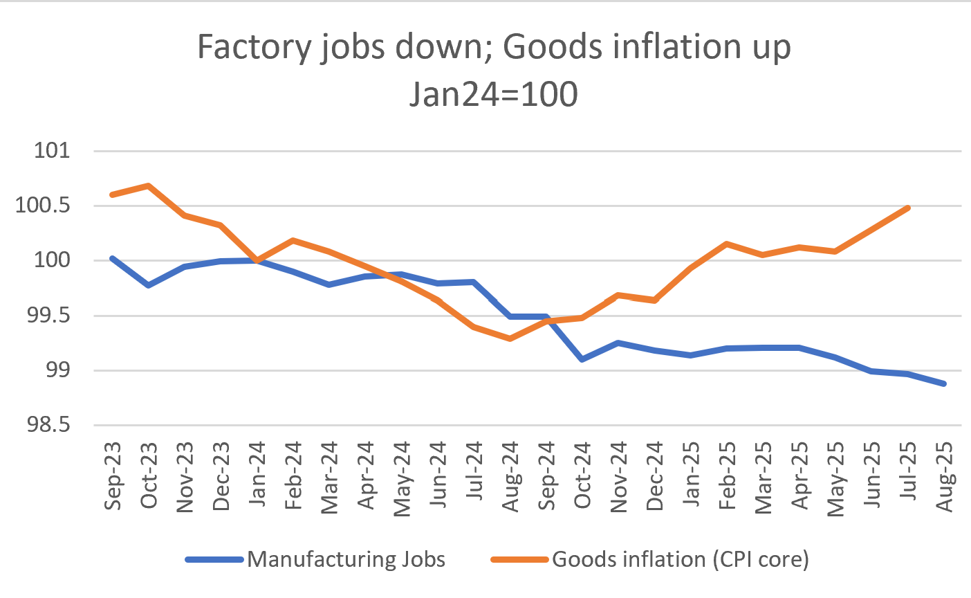 But look at this figure, Mr. President. It shows that factory jobs were already losing ground under our watch, and that’s continued this year, including 12,000 down in August. Meanwhile goods inflation—the sector most vulnerable to tariffs—has reversed course and is climbing.