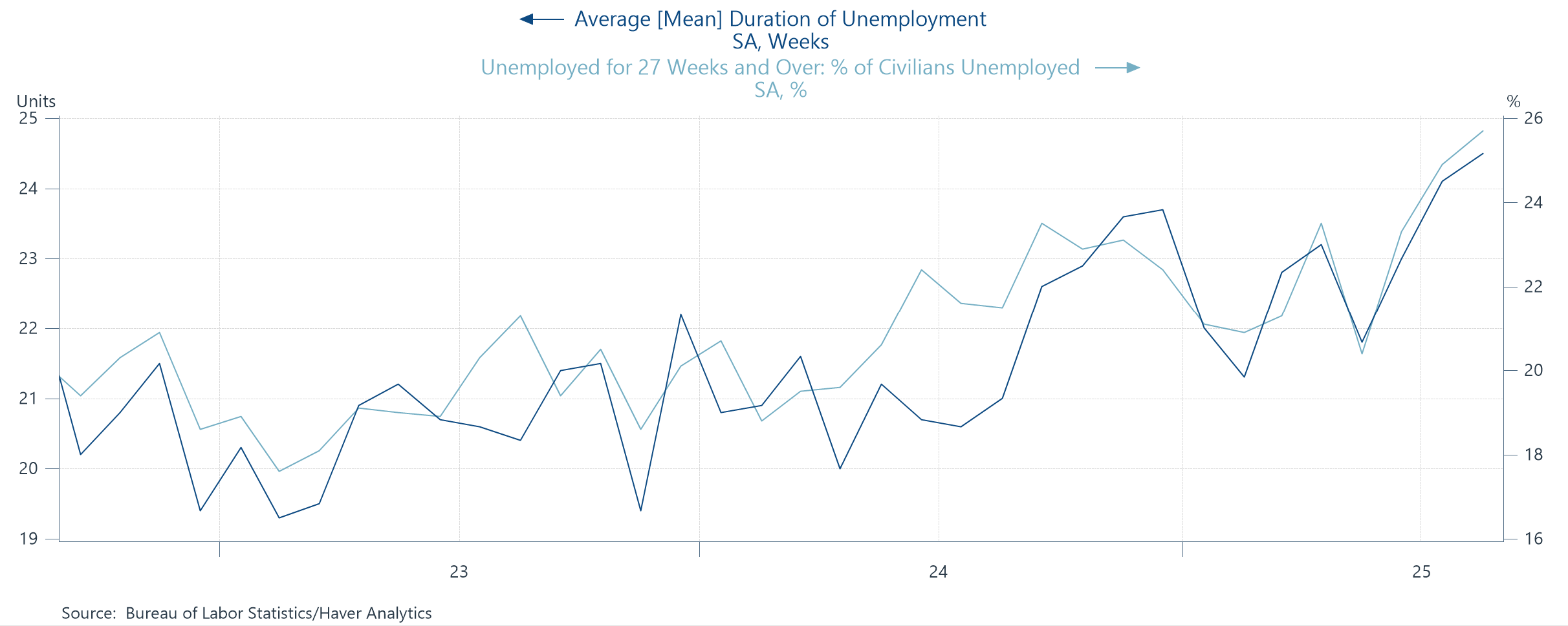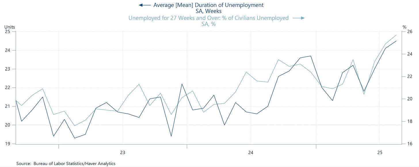 —Your policies have birthed a low-hire, low-fire job market. That 2nd part is clearly good; we don’t have recessions without layoffs. But we can see the damaging effects—both in living standards and in vibes—in the rising duration stats for time spent unemployed: