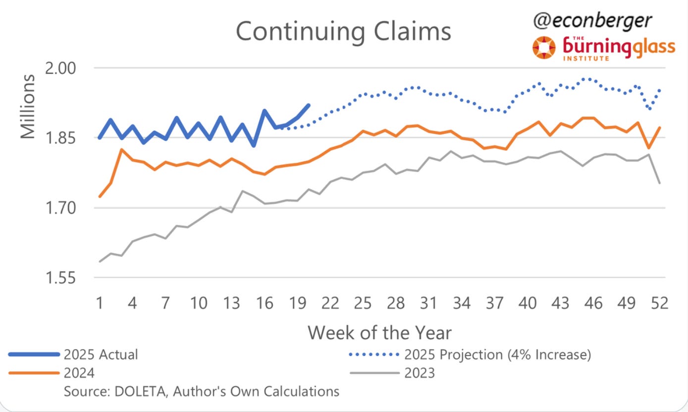 Which is why this figure from Guy Berger, my go-to guy on Thurs AM when the Unemployment Insurance claims data come out, caught my attention. Guy tweeted that “Continuing claims really does [I would have said “do”] look like a modest deterioration relative to benchmark - this week's print was about 32K above it.”