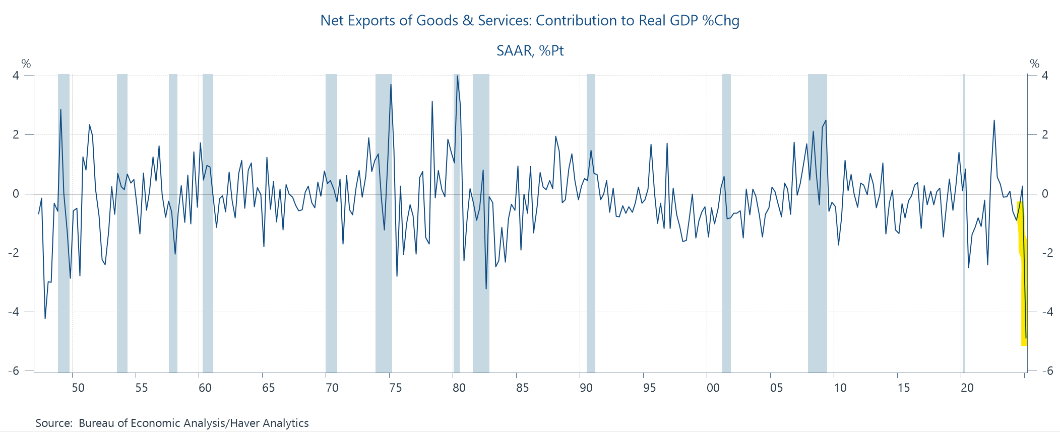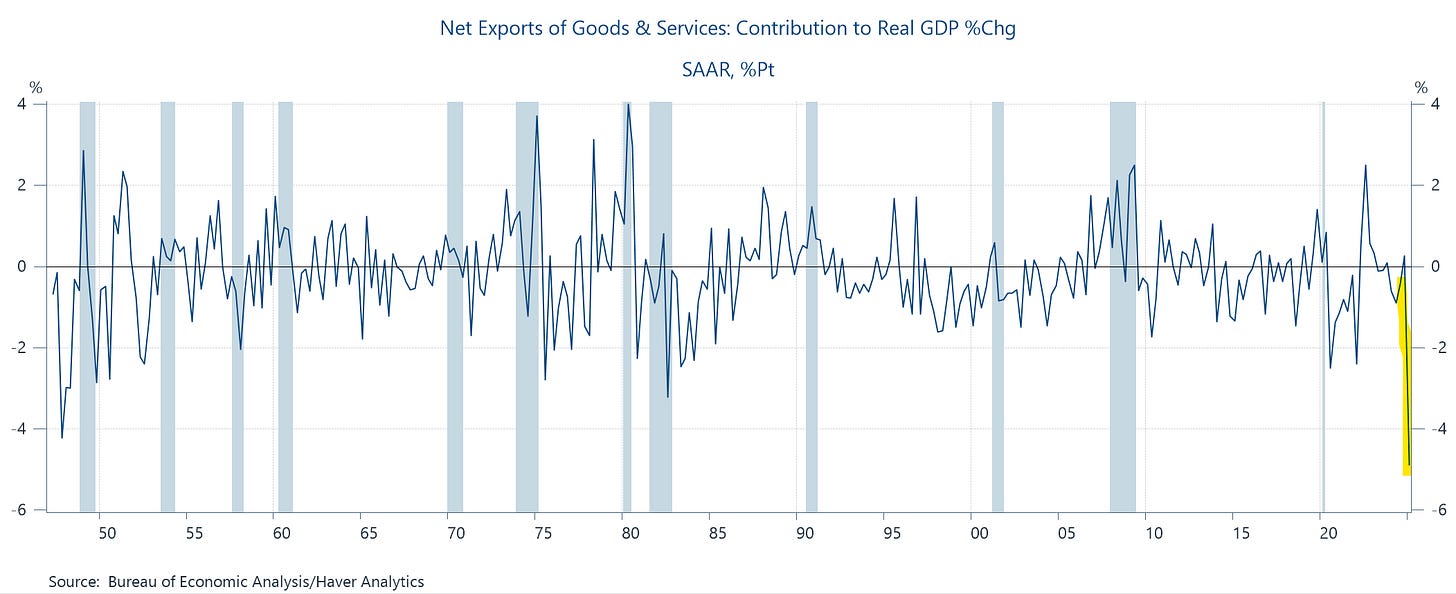 The slight contraction in the first and second prints were due to an historically unprecedented downward spike in the trade balance (imports are a subtraction to GDP, necessary in order to net out foreign, as opposed to domestic—the D in GDP—purchases), which came in even a bit larger in today’s update (it went from taking 4.8 ppts off of the growth rate to 4.9 ppts due to a markup in imports not offset by a smaller markup in exports):