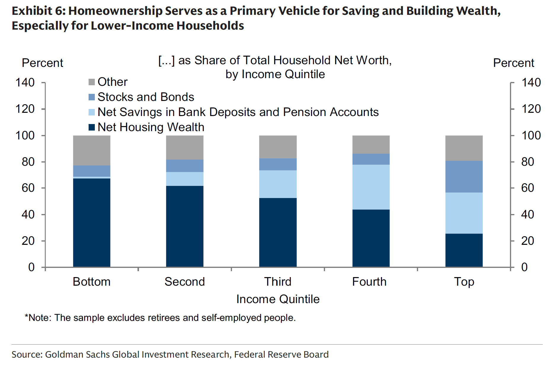 First, owner-occupied housing is the primary way that many households, especially low-income households, save and build wealth. [The figure below] shows that real estate assets account for nearly 70% of the net worth of households in the bottom income quintile but only 20% for households in the top.