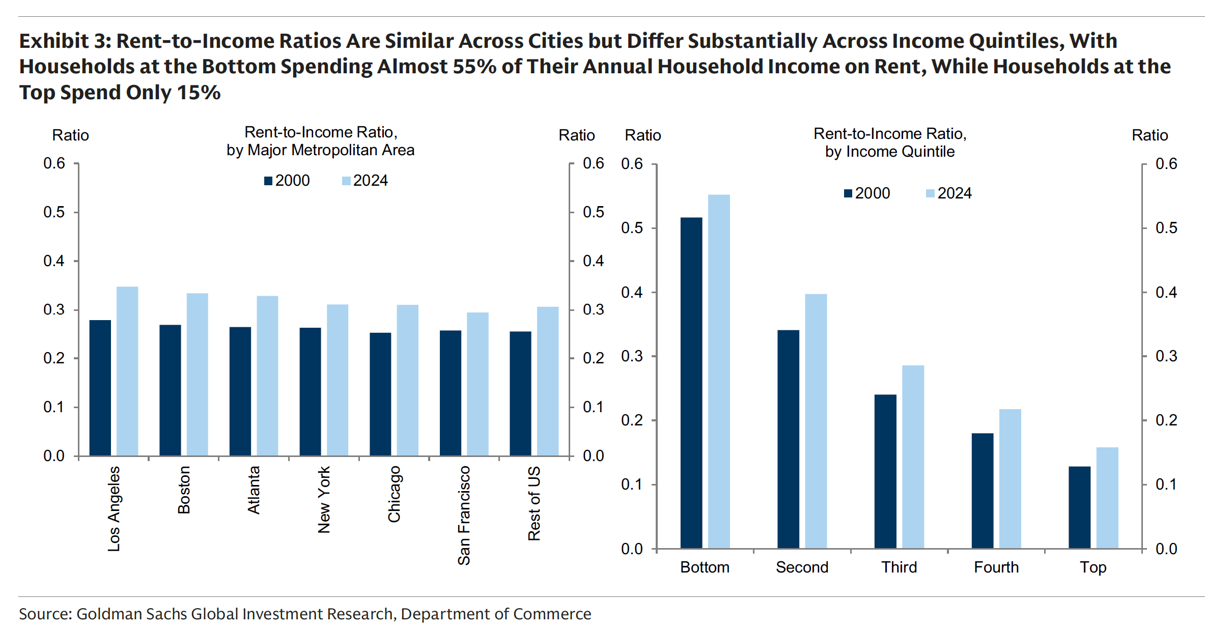 As the very sharp Elsie Peng points out in a new piece from GS Research (paywalled), rent/income ratios are up from 2020, are pretty similar across geographies, and are much higher at the low end. That’s long been the case, but it’s gotten worse: