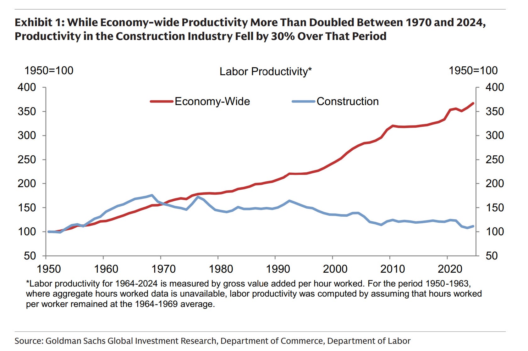 Now, there’s a lot that goes into that gap, including lack of technological innovation and the fact that if you go by a construction site, it may not be exactly just a bunch of hammers and nails at work but, again citing GS Research, “most of the major machines used for construction today had already been invented in the 1950s.”