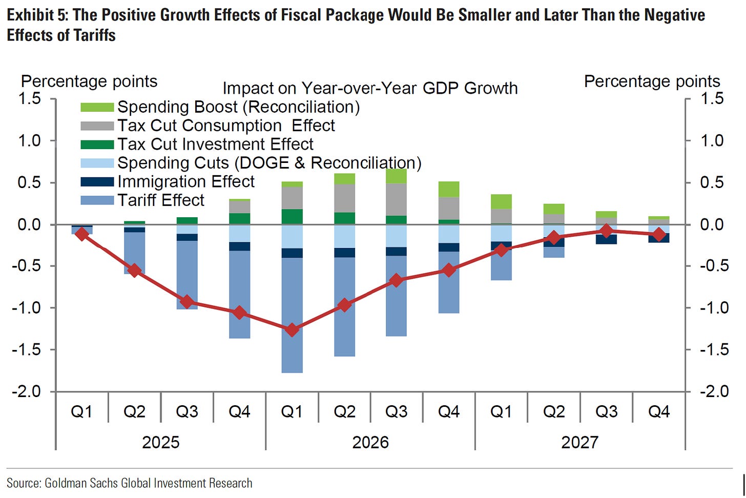 That’s a drag on growth, one which leads Goldman Sachs researchers to conclude that “the hit to growth from tariffs will more than offset the boost to growth from the fiscal package.” Their figure, below, predicts that the sting of the import taxes will subtract about a percentage point of growth this year and maybe three-quarters of a point next year. After that, the growth effects, positive and negative, fade for both the tariffs and the BUBB.