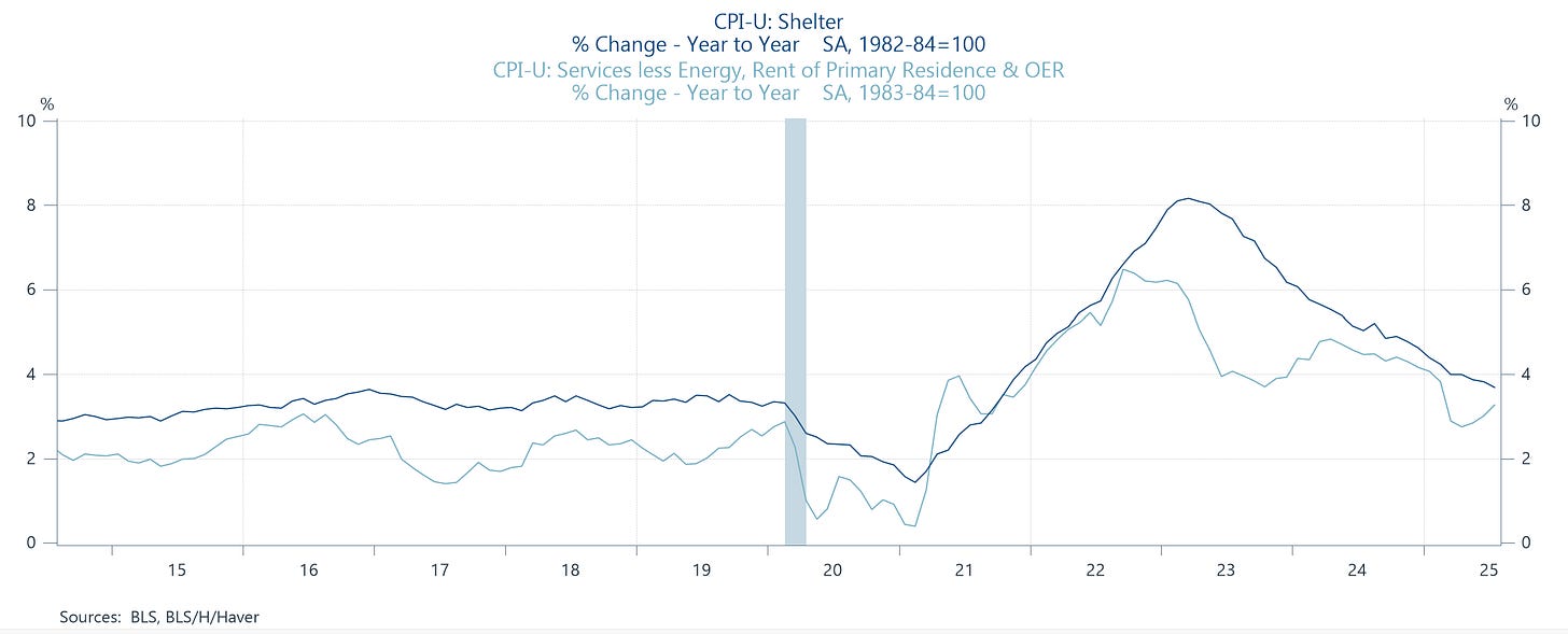 Housing inflation is progressing back to pre-pan levels and is almost there, but core services are taking their time to get back and recently turned up a bit. And, as noted above, the tariffs are boosting goods prices.