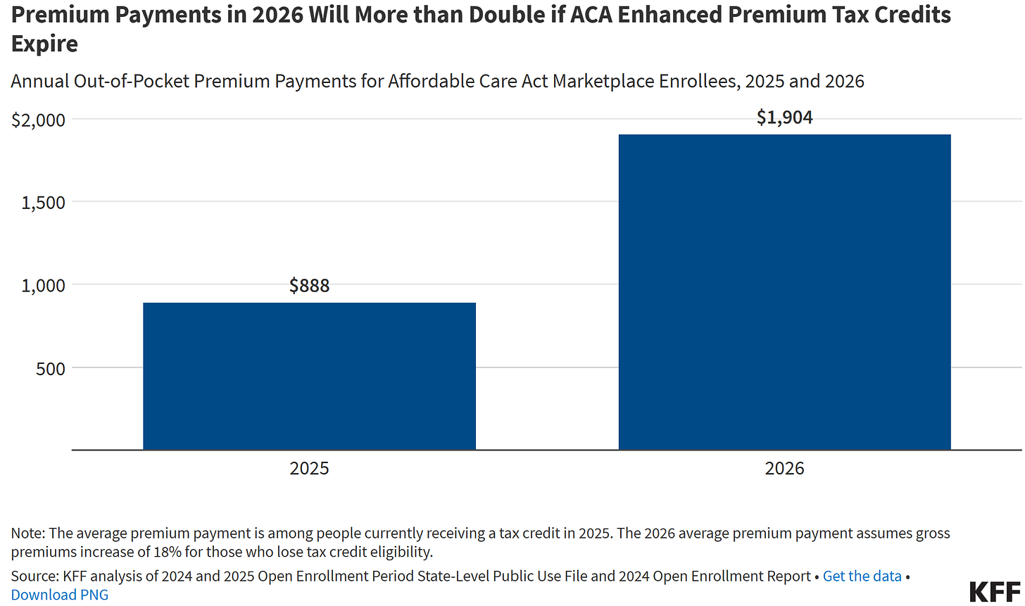 …if Congress extends enhanced premium tax credits [this is what the Ds are pushing for—JB], subsidized enrollees would save $1,016 in premium payments over the year in 2026 on average. In other words, expiration of the enhanced premium tax credits is estimated to more than double what subsidized enrollees currently pay annually for premiums—a 114% increase from an average of $888 in 2025 to $1,904 in 2026.