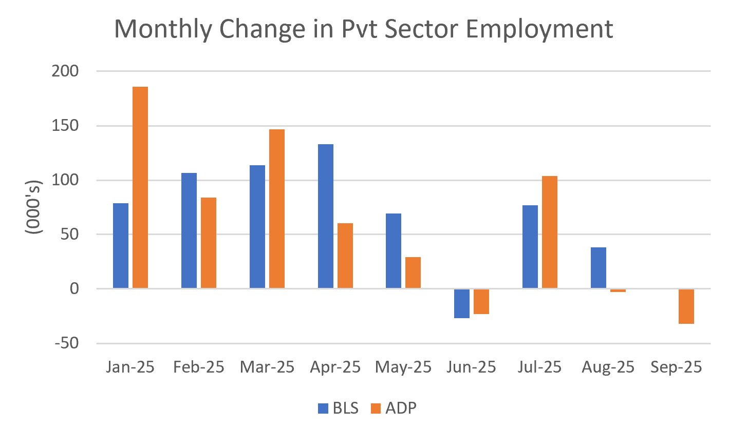 Because of the shutdown, we do not expect to get the September jobs report this Friday. The Automatic Data Processing (ADP) company, however, has long released its own version of the payroll side of the jobs report, for the private sector only. It broadly tracks the BLS survey but certainly not on a monthly-change basis, and given that the BLS has long been the gold standard, I’ve also thought it makes more sense to wait a couple of days—the ADP report comes out on Wed, two days before the BLS report—and just go with the BLS report. But for now, we do not appear to have that luxury.
