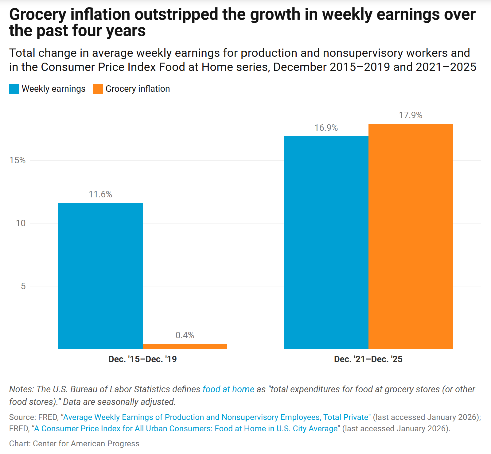 For the five years, pre-pandemic, grocery inflation was essentially zero, while (nominal) weekly earnings were up 12% (these are cumulative growth rates, over the full period). Then from ‘21-’25, grocery inflation spiked up 18%, and while earnings accelerated too, they lagged behind groceries.