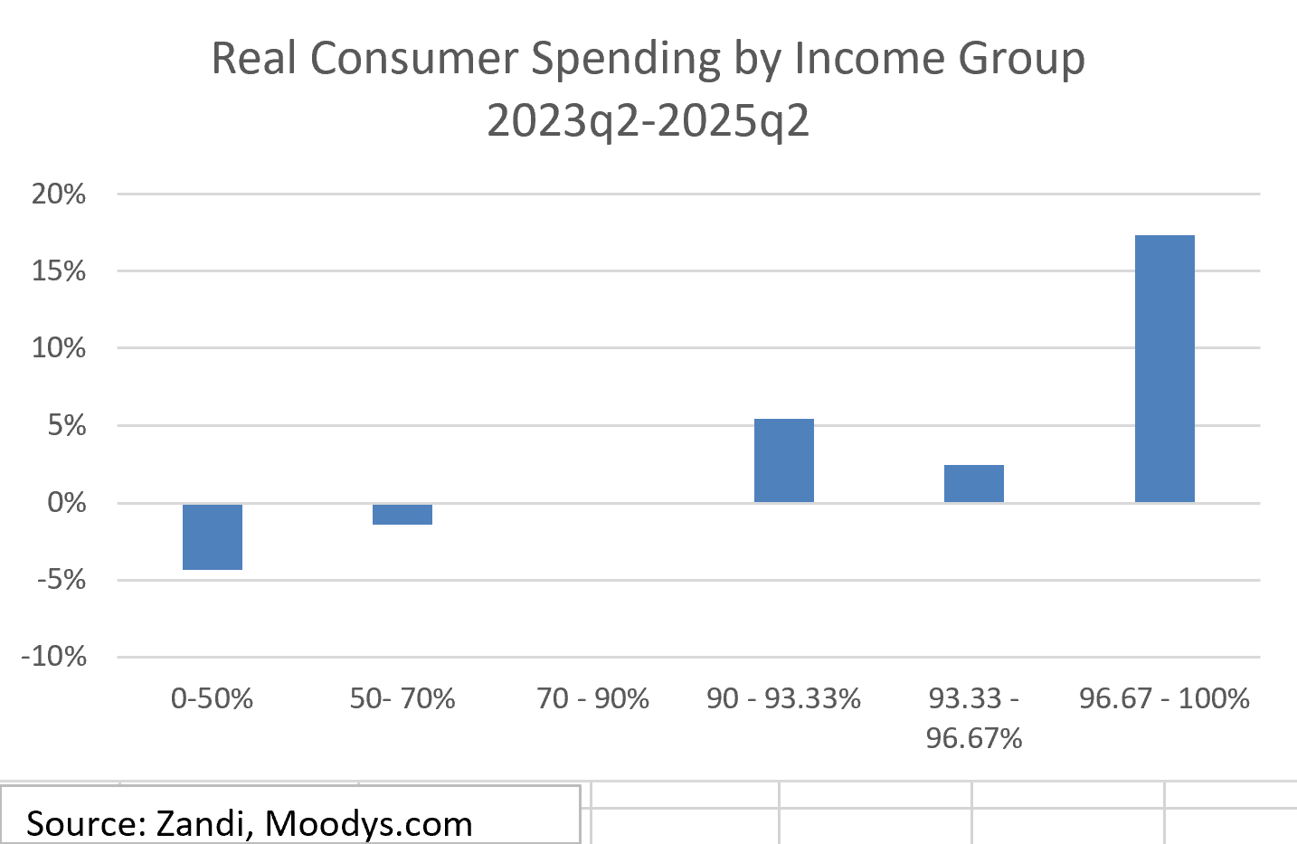 As we allude to in the oped, if we’re right and the AI bubble should burst, the timing is inopportune in a specific way regarding the wealth effect, which one recent estimate puts at just under 3 cents on the dollar (one dollar of added stock market wealth adds 2.8 cents to consumer spending). In the piece, we cite Mark Zandi’s consumer spending by income class, but here are the data, showing real changes over the past two years (and here’s a great Zandi piece on these wealth effect dynamics).