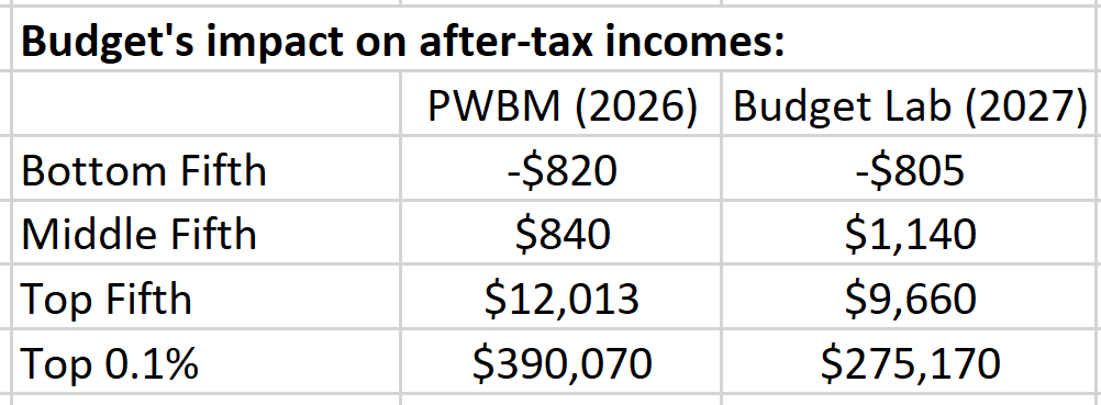 Who wins, who loses?: Estimates vary in magnitude but not in sign. That is, the bottom loses income; the middle on up gains income but the big winnings are predictably at the top. Here are estimates from the Penn Wharton Budget Model and the Yale Budget Lab (links below).