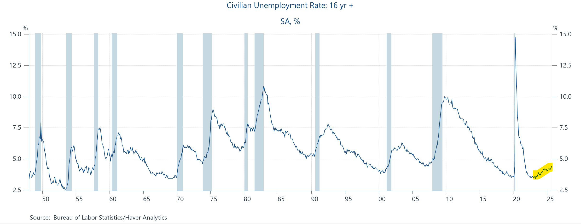 In historical terms, 4.4% is at the 28th percentile of the distribution of the monthly rate since 1948, but because changing demographics affects the level—more young people in the labor force tends to mean higher unemployment—you want to look over shorter periods. Starting in 2000, 4.4% is the 34th percentile, so maybe not all that low.