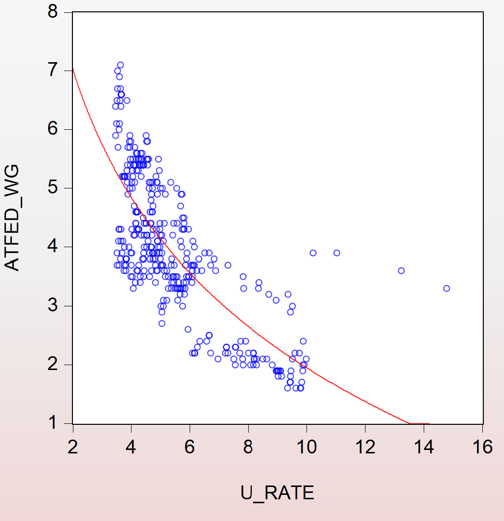 It’s a full point above where it was in April of ‘23. And as the figure below shows—a scatterplot of yearly nominal wage growth from the Atlanta Fed series against the unemployment rate, higher unemployment means slower wage growth, with a steep part of the non-linear (log) curve right around where we are now. So, this is costly for workers, especially for workers of color, whose jobless rate is often multiples of the overall rate.