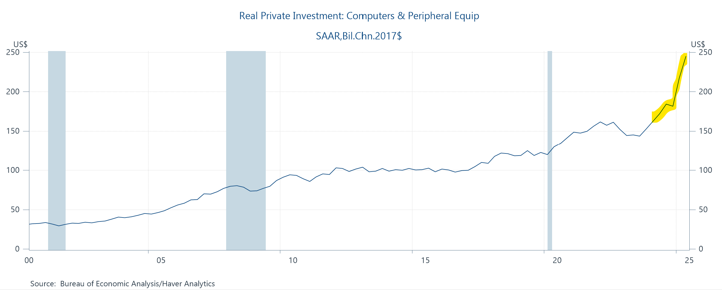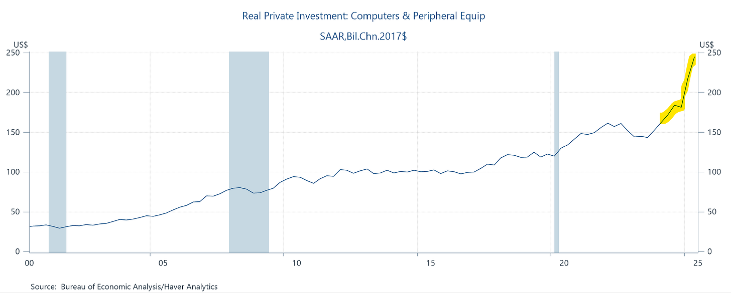 They warn that we shouldn’t read too much into that huge share because perhaps the capex would have flowed elsewhere, but that’s not the main problem with this inflated share. That would be that it includes imports, which surged of late in an effort to front-run tariffs.