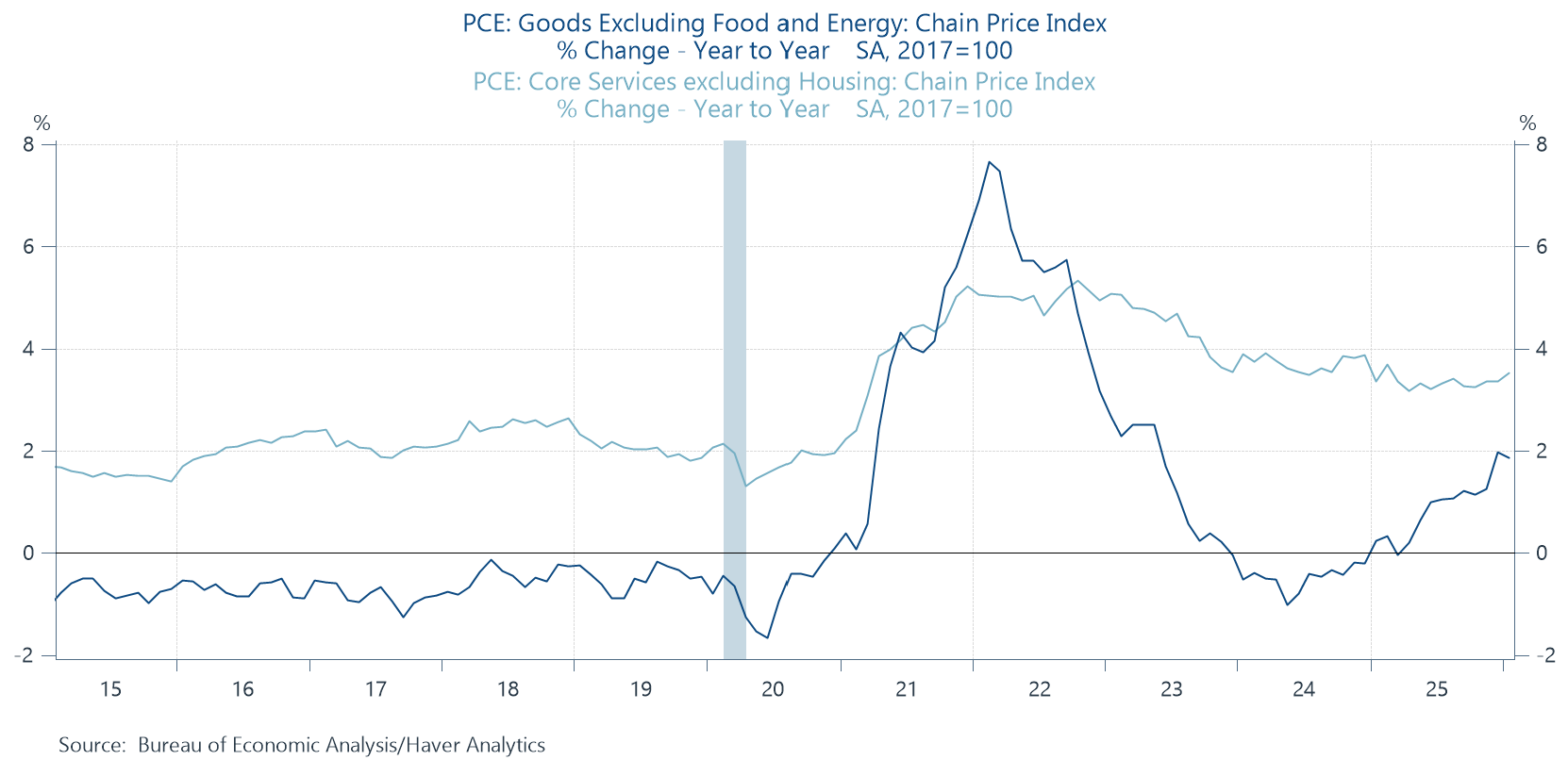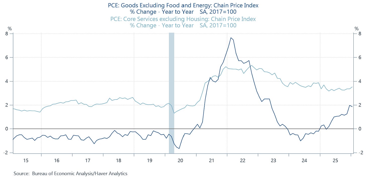 What you see above is that our most recent read on core PCE is growing faster than it was a year ago, and possibly accelerating a bit. Some unwelcome trends were also seen under the hood. EG, core goods inflation, which likely reflects tariff effects, has gone from its pre-pandemic pattern in ‘24 to tracking significantly higher this year, and core services inflation, which doesn’t have a direct tariff connection, is stuck well above its pre-pan rate.
