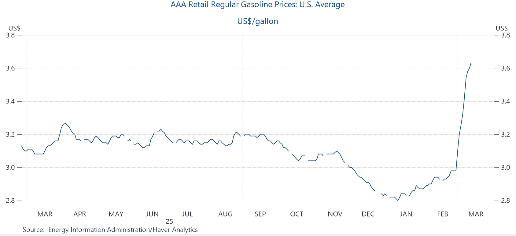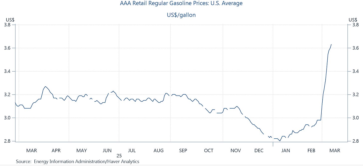 Of course, the first post-baseline impact on consumers is gas at the pump. The figure below is through Friday. Sunday AM, the gas price is up again, hitting $3.70, its highest since Oct 23 and 26% above its value of $2.93 a month ago.