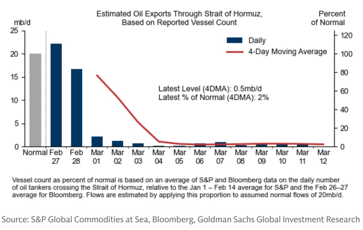 From the start, I’ve argued that the key variable re economic impact is duration. In this regard, look at flows through the Strait of Hormuz, or the lack thereof: