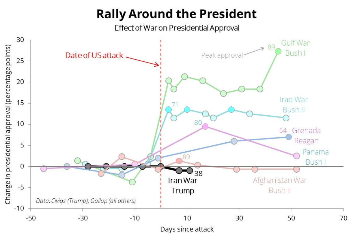 Other than his MAGA base, I can’t imagine anyone is buying such misinformation, and the polls strongly suggest I’m right about that. I’ll just say that unilaterally taking the country into an immediately unpopular war and lying about its economic impacts is both a losing political strategy (see figure below, from this source) and antithetical to democracy.