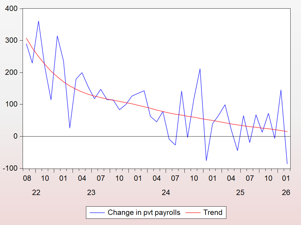 The last pre-war baseline point I’ll make is about employers’ hiring strike in the labor market, reposting a figure from last week on the February jobs report. It shows the very jumpy monthly changes in private-sector jobs with a smooth trend cutting through the data. The last trend data point was about 15,000 added jobs per month, which, should it persist, is too low to prevent unemployment from rising.