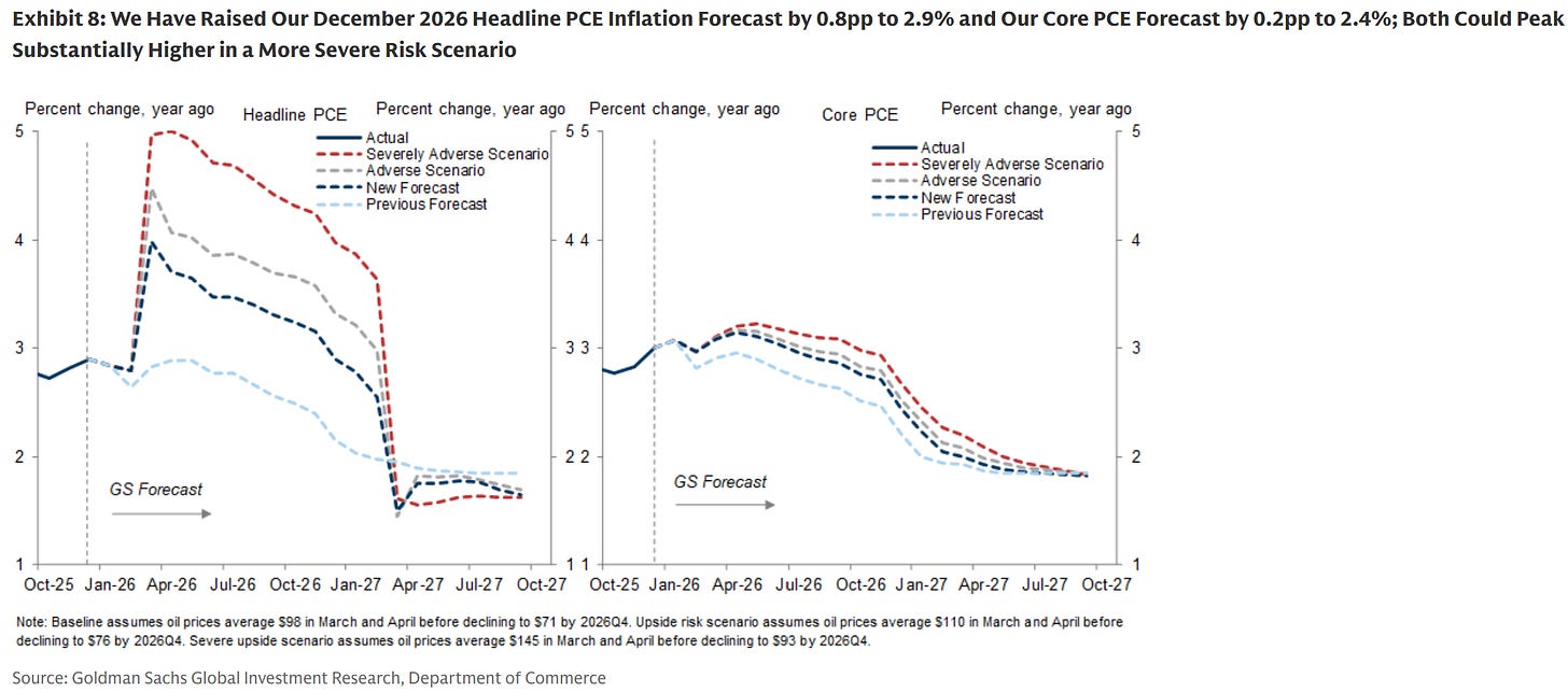 Re where inflation is headed, here’s a repeat of a slide I shared from GS Research earlier in the week, showing that their baseline forecast is for PCE inflation (the gauge the Fed follows most closely) to jump about a point, with much bigger jumps from more adverse oil scenarios. Their core forecast is, as expected, more benign, but, in tandem with the news above about Jan’s PCE, it should surprise no one that futures markets have gone from expecting two Fed cuts this year to expecting none. This is one of the factors pushing up the mortgage rate, btw.